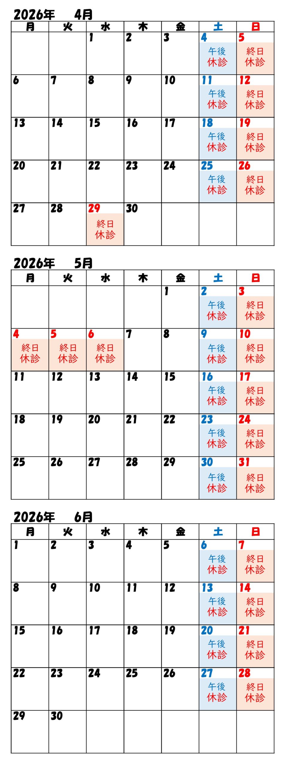 2026年4月から6月の休診についてお知らせします。なお、休診日については変更される場合がございます。都度、ご確認のほど宜しくお願い致します。
